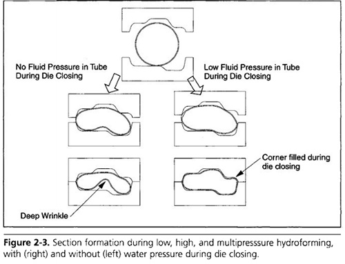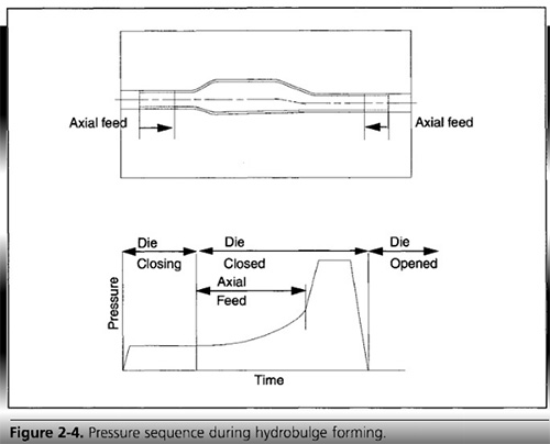 內(nèi)高壓成形也被稱為壓力順序內(nèi)高壓成形(PSH)。對于多壓力工藝,流體被引入管,而模具仍然打開,壓力增加到模具關(guān)閉壓力,一旦模具關(guān)閉,壓力增加至標(biāo)定壓力。