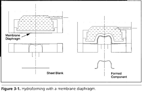 膜片液壓成形這種方法是在20世紀(jì)40年代末50年代初發(fā)展起來的,主要用于制造深沖飛機(jī)部件,該技術(shù)是為了滿足生產(chǎn)小批量深沖件的低成本方法的需要而發(fā)展起來的。