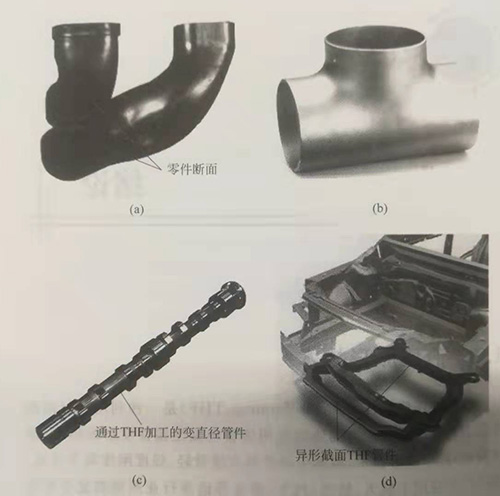 管材液壓脹形(tube hydroforming,THF)是種利用管材內部液壓力和管端軸向推力的協調作用使管坯發生塑性變形的精密(或半精密)近凈成形技術,因其生產件具有質量輕、強度剛度高等優點,現已廣泛應用于航天、航空、汽車、家電等諸多行業所需的復雜異形截面中空件的生產,典型成形零件如圖1-1所示。