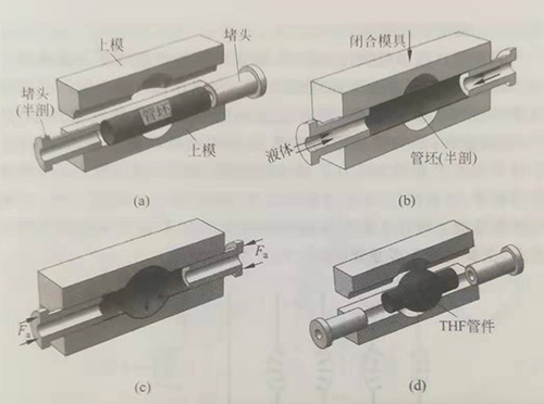 (d)管坯在內壓P和軸向壓力F的作用下脹形,填充模具型腔。