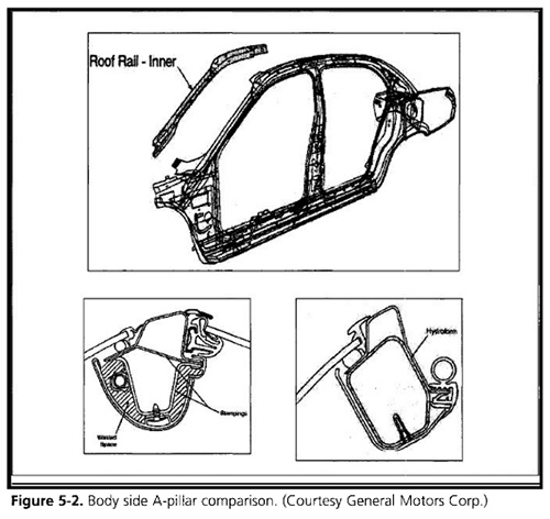 在圖5-2中所示的車身結構的A柱部分,比較沖壓車頂軌內截面設計與液壓成形設計(Bruggemann?1997)。