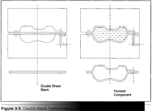 雙毛坯液壓成形方法也稱為枕形成形或平行板液壓成形,如圖3-5所示。在上下模之間放置兩個圍繞外圍焊接的已開發的鈑金坯料。