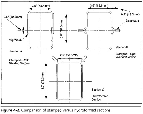 圖4-2比較了兩個沖壓組件與相同的內高壓成形組件。