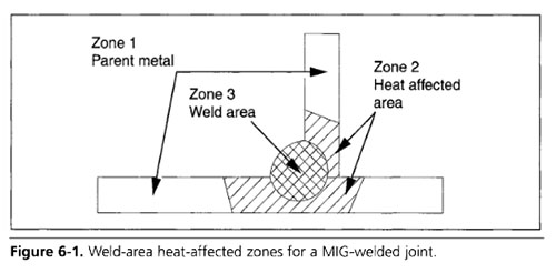 從接頭完整性的角度來看,MIG焊接接頭區(qū)域包括三個主要關注區(qū)域,如圖6-1所示,區(qū)域1是焊接在一起的母材,區(qū)域2是熱影響區(qū)域,區(qū)域3是凝固的熔融金屬。這些區(qū)域中的每一個可以顯示顯著不同的冶金特性(晶粒尺寸、化學和表面細化),并且可以具有不同的機械性能(屈服應力和伸長率)。