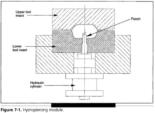 圖7-1所示的典型液壓穿孔模塊由沖頭、導窗、沖頭保持架和液壓缸組成,并在每個孔位置嵌入液壓成形工具中。