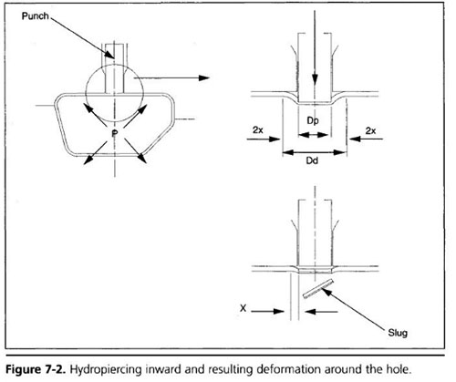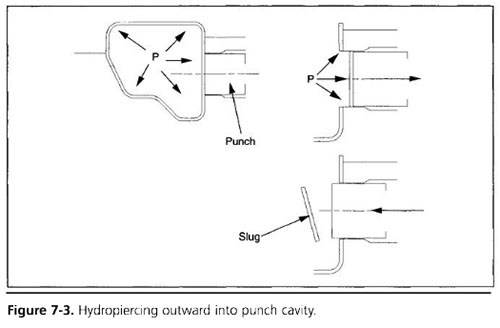 采用第二種方法時,成形液將材料推出沖孔,如圖7-3所示。這種方法主要用于非常大的孔和槽。