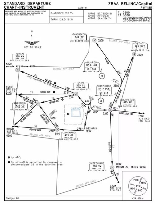 北京首都機場的一個離場程序示意圖,圖中虛線區域為北京城區的飛行禁區。