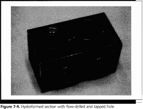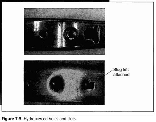 在液壓成形過程中,可以對許多不同形狀和尺寸的孔進行液壓穿孔。圖7-5顯示了生產零件上直徑為0.5英寸(12.7毫米)的圓孔、0.5英寸(12.7毫米)的六邊形孔和一個大T形槽。