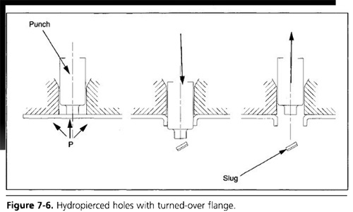 在液壓成形操作中,還可以形成需要翻轉法蘭以獲得強度的孔和槽,以及適合自螺紋螺釘的擠壓孔,如圖7-6所示。翻邊法蘭的最大深度限制為零件外表面材料厚度的兩到三倍。即使是在這些孔上,如果彈頭不干擾孔的功能,它們也可以保持連接。