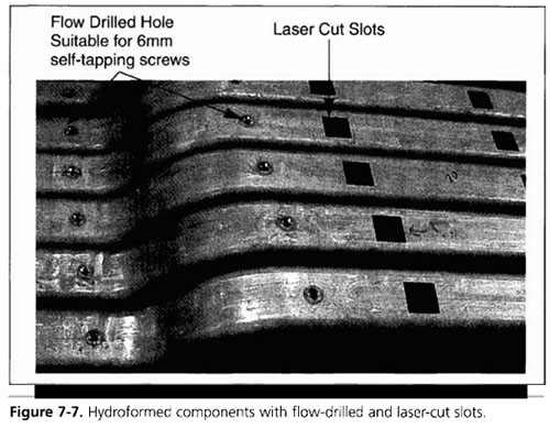 這種方法特別適用于大批量生產的部件,與在模具中對孔進行水淹處理相比,這些部件的孔型在部件的使用壽命期間可能發生變化。使用此方法切割的孔、槽和其他特征的位置精度需要一個可重復的、可靠的夾具系統。圖7-7顯示了帶有流動鉆孔和矩形激光切割槽的液壓成形部件。