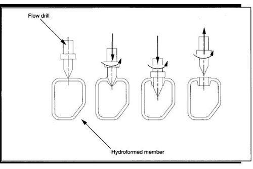 流動鉆孔適用于自攻螺釘,這種特殊的鉆孔形式產生熱量時,紡紗對液壓成形的組成部分表面,熱軟化材料變形形成一個法蘭孔而不產生金屬碎片,流動鉆井作業通常需要5到6秒每孔,流程鉆進順序如圖7-8所示。