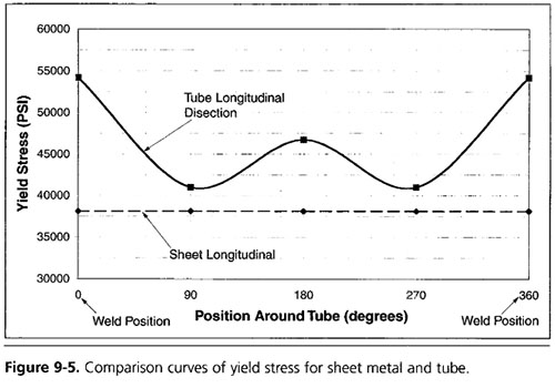 結果有顯著差異,性能的變化取決于軋機設計和設置參數,圖9-5顯示了金屬板和管子屈服應力的比較。