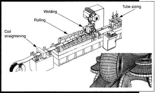 在軋管機上,鋼卷被切割成一定尺寸,然后板材被送入若干成形輥、焊接站、最終尺寸,然后在連續高速過程中切割成一定長度,如圖9-1所示。