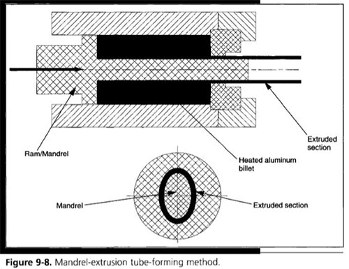 可以使用擠壓過程創建復雜的管狀截面。如圖9-7所示,可以制作具有可變壁厚的規則管狀截面以及具有單個或多個單元和法蘭的截面。這個過程最常用于制造各種鋁合金的管狀型材。