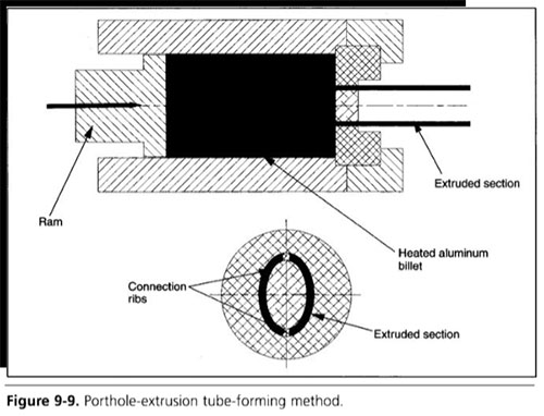 這種方法的主要優點是在擠壓型材中沒有焊縫,如圖9-9所示,孔擠壓可以使型材具有更高的復雜性。