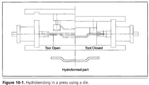 此方法僅適用于某些零部件幾何圖形,其中折彎主要位于單個平面中;彎曲是在液壓成形模具中通過模具關閉的動作產生的,如圖10-1所示。