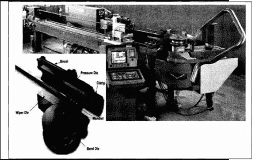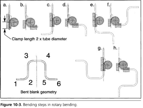 典型的旋轉拉伸彎曲機如圖10-2所示,圖10-3顯示了旋轉彎曲的一系列典型彎曲步驟。