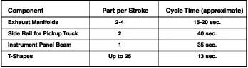 然而,限制生產速率的主要因素之一是彎曲和預成形操作。因此,為了提高生產率,可以使用幾種彎曲機向管件液壓成形過程提供零件,或者可以同時形成多個零件。下圖中給出了一些樣品的生產速率。