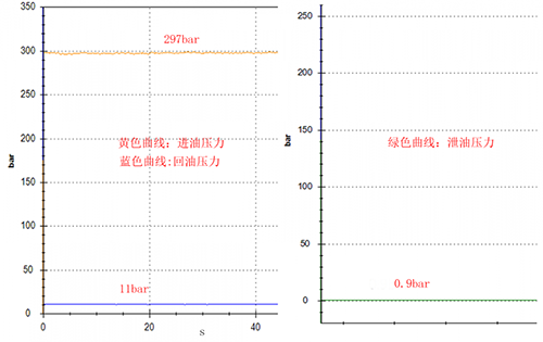 全速工況為發動機在1400rpm情況下,馬達進油口壓力:297bar,出油口壓力:11bar,殼體泄油壓力:0.9bar。