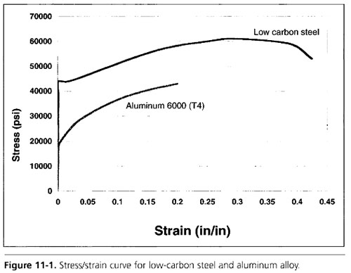 通過這些步驟材料的應(yīng)變硬化是累積的。當(dāng)材料應(yīng)變變硬時(shí),它就接近其失效點(diǎn);汽車級低碳鋼和鋁合金6000(T4)的應(yīng)力/應(yīng)變曲線如圖11-1所示。