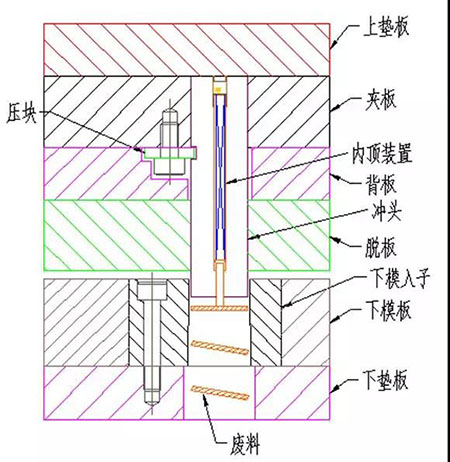 防跳廢料處理包括處理廢料上沖頭防跳廢料、沖頭做內脫料銷防跳廢料、加內吹防跳廢料、下墊板做氣孔抽廢料及處理下模刀口防跳廢料。本文興迪源機械帶來沖壓與模具工藝:沖壓模具防跳廢料的處理,處理好的真不多!