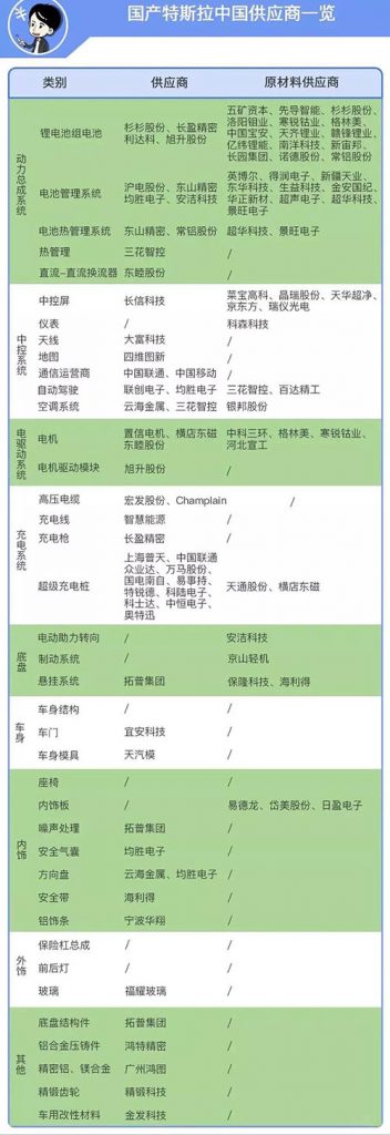 從目前情況看,特斯拉核心一級供應商多來自歐美、日本等地,國內企業多作為二級供應商。比如,目前特斯拉的鋰電池PACK制造商為日本松下,正極材料和隔膜供應商為日本住友化學,負極材料供應商為日本日立化學,電解液由日本三菱化學生產。